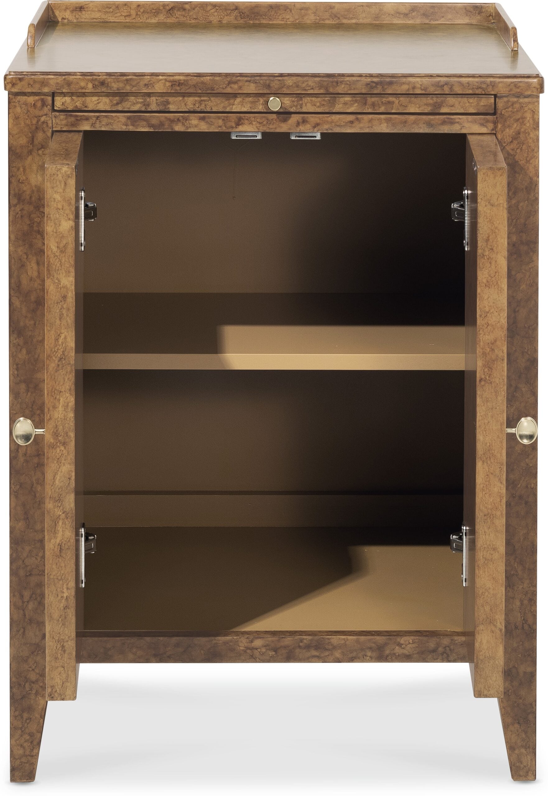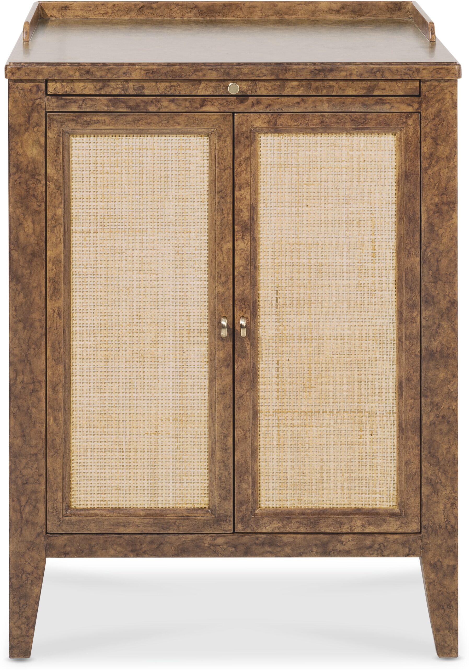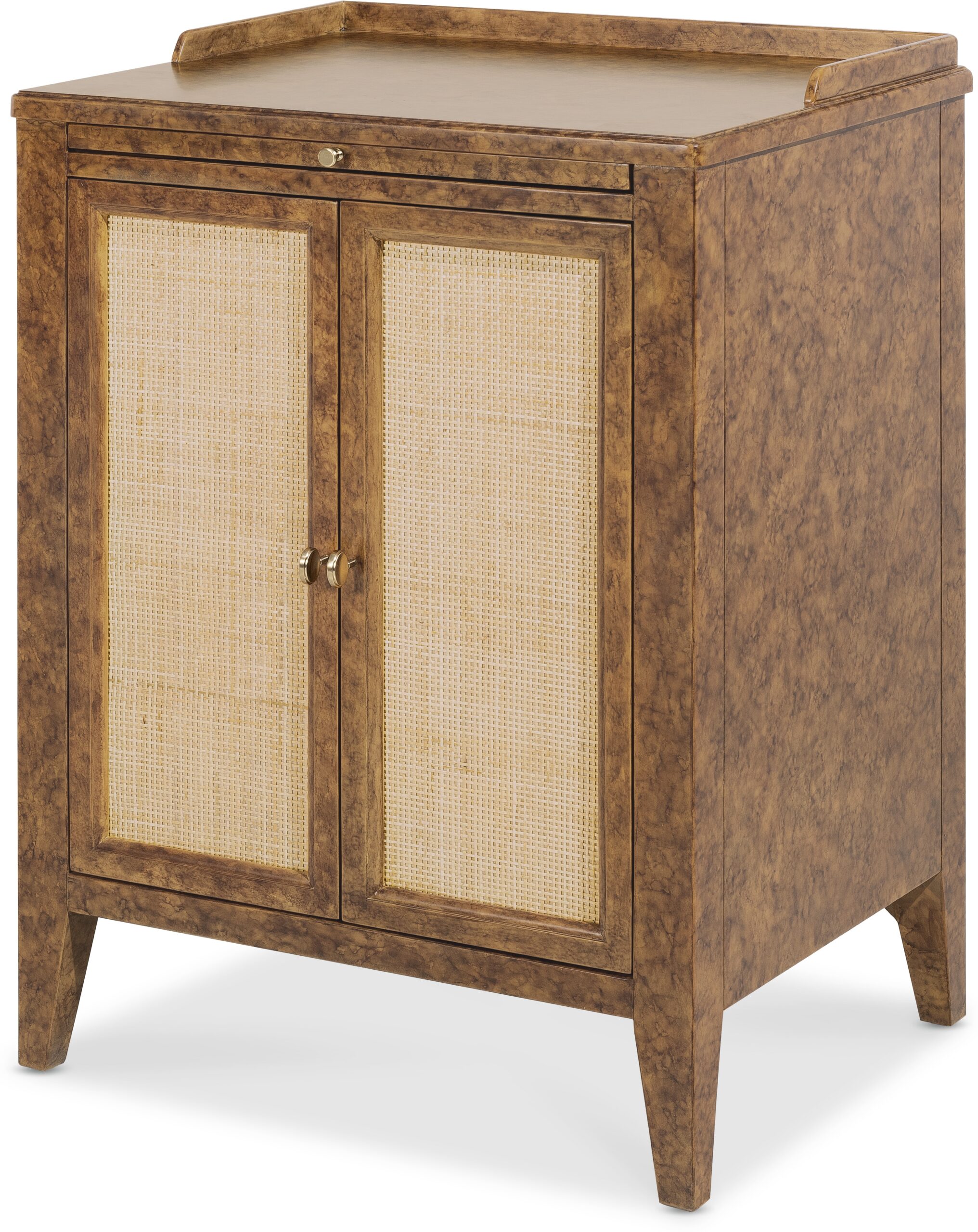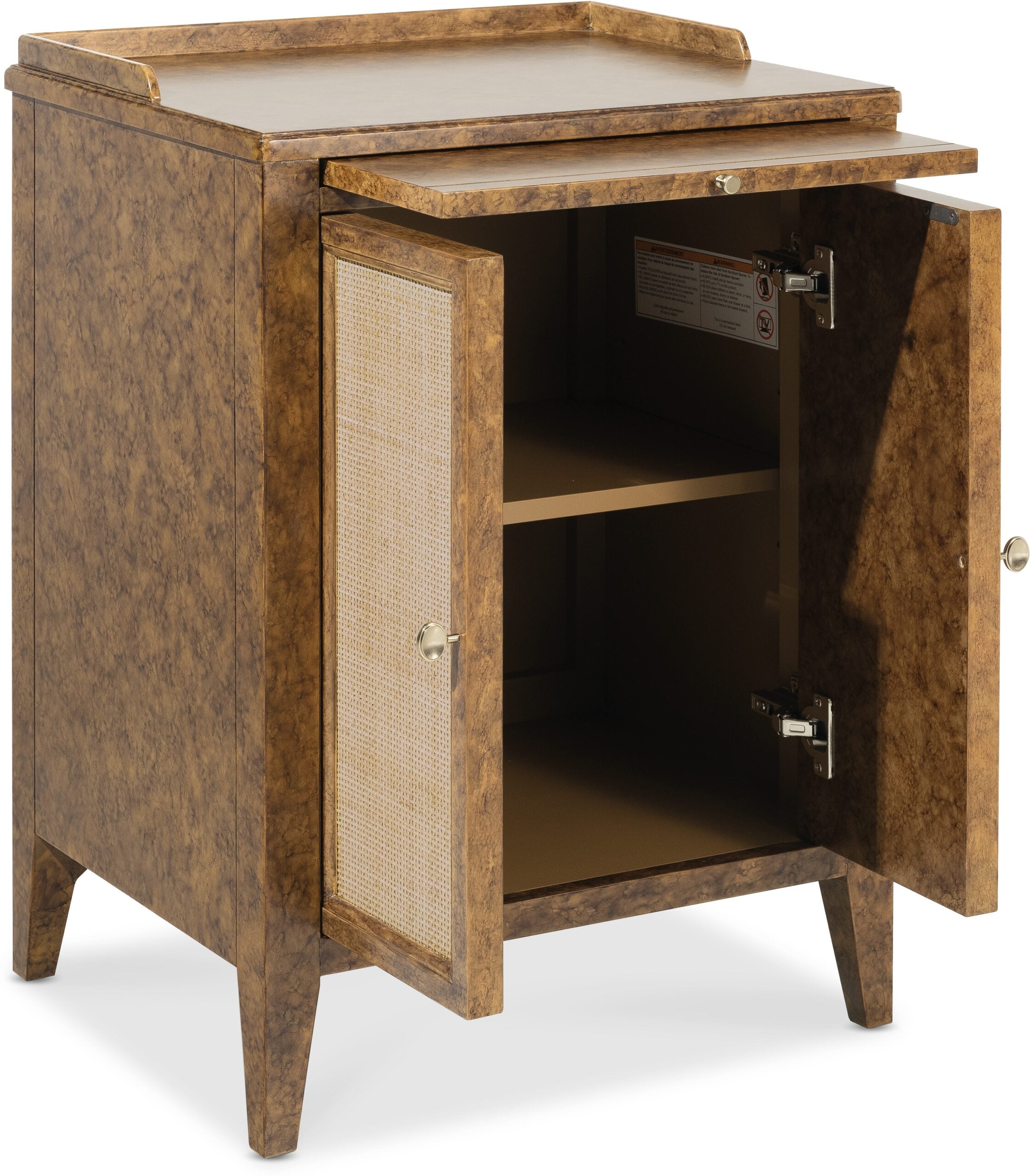 The Archives Two-Door Nightstand is a unique addition to any bedroom. Featuring a Mottled Amber faux-tortoise shell finish and woven cane door fronts, this nightstand combines texture and style. Inside, an adjustable shelf provides versatile storage, while a pull-out tray and gallery rail on top add functionality to this chic, medium wood piece. Archives taps in to a design trend that mixes modern, trendy styles with historic elements, known as “hipstoric”. Complementing a variety of design styles with timeless forms and elements, the trend creates a sense of undeniable luxury. Layering rich and authentic materials, such as figured walnut veneers, top grain leather, woven raffia, and polished marble, Archives’ assortment speaks to consumers who yearn for structured elegance with a dash of mystery.