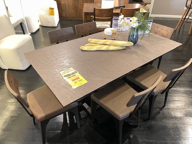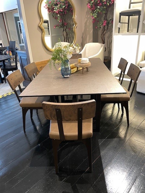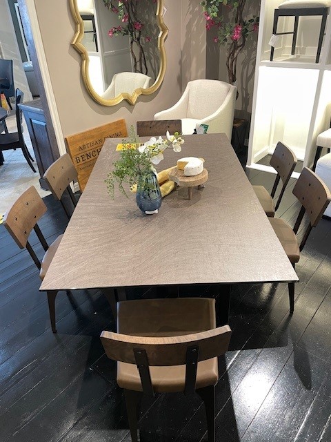 The Ezra Dining Table is a masterpiece of design that seamlessly blends uniqueness and the joy of gathering. At the core of the Ezra Table is its beautiful base, a harmonious marriage of two sled legs united by a rectangular piece. The dining table is topped with Tuscan Starstone for a contemporary flair. The Starstone has the look and texture of brown stone with a slight sheen on the surface, mounted on glass. Starstone is easy to maintain, resistant and durable.