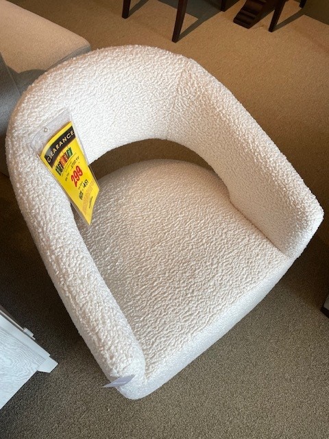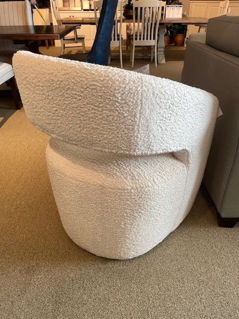 The Aries upholstered dining chair is our unique take on a barrel chair, ready to cocoon you with the comfortable curve of wraparound back and arms. The Aries is completely upholstered in touchable, Natural polyester shearling. Recessed casters allow for easy movement.