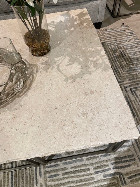 - Honed Bianco Travertine-laminated stone top with chiseled edges
