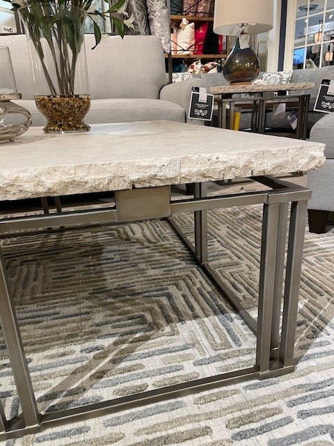 The Riverton cocktail table’s design finds its inspiration in the Arts and Crafts period, with simple lines that celebrate form and style. Metal bars interlock for the base, allowing a honed Bianco Travertine laminated stone top to float above the frame.