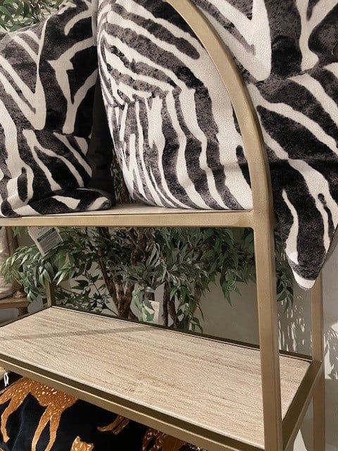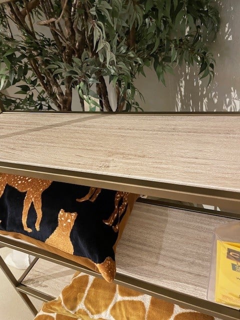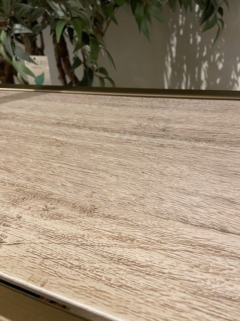 - An aged gold finish on the metal frame and a translucent multi-step lacquer distress finish on the wood.