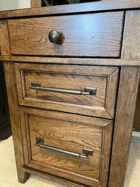 The Carolina Park Credenza and Hutch set brings refined style and smart organization to your home office. Expertly crafted of rubberwood solids and Split Heart White Oak veneers in a rich Amber Brown finish, this set combines classic design with everyday function. The credenza offers locking file storage drawers, a flip-down keyboard tray, and additional storage drawers to keep your workspace tidy and efficient. The hutch adds a stately touch with heavy crown molding, wood-framed glass doors with decorative mullions, and adjustable shelves for display or storage. Thoughtful features like touch LED and task lighting and wire management provisions complete this versatile and elegant office solution.