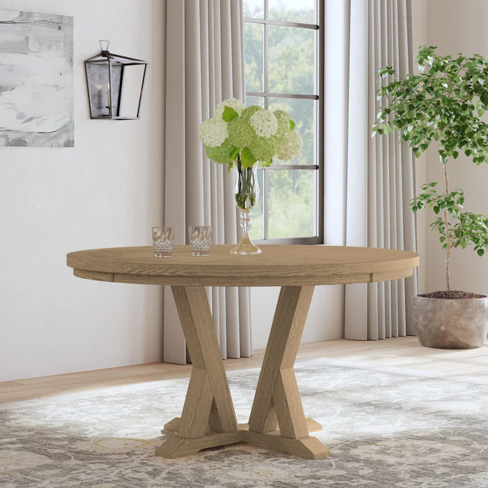 Elevate your dining space with the casual sophistication of the Lattice round dining table. Enduring craftsman style captivates the eye with bold architectural shapes and a striking woodgrain pattern. Comfortably seating up to 5 people, this table features a natural oak finish for a touch of inviting warmth. Crafted from high-quality, ethically harvested FSC certified woods, the Lattice round dining table ensures lasting durability and beauty for years of memorable mealtimes.