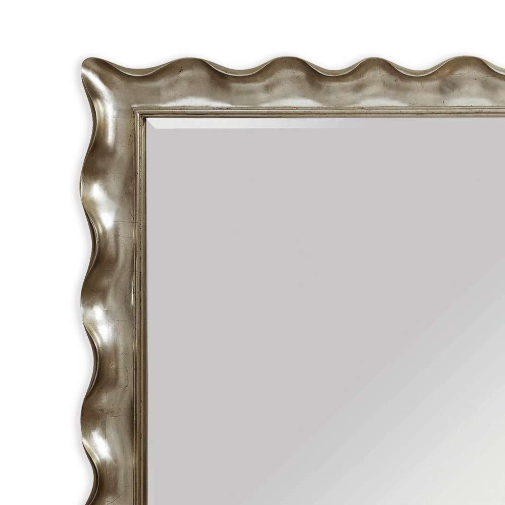 The Pie Crust Floor Mirror exudes glamour and traditional charm with its silver leafed frame, boasting a distinctive wavy edge reminiscent of art deco aesthetics. Its rectangular shape offers timeless elegance, while the beveled edge of the large mirror glass adds a touch of sophistication. Crafted from durable wood, this mirror is not only stylish but also built to last, making it a stunning focal point in any living space.