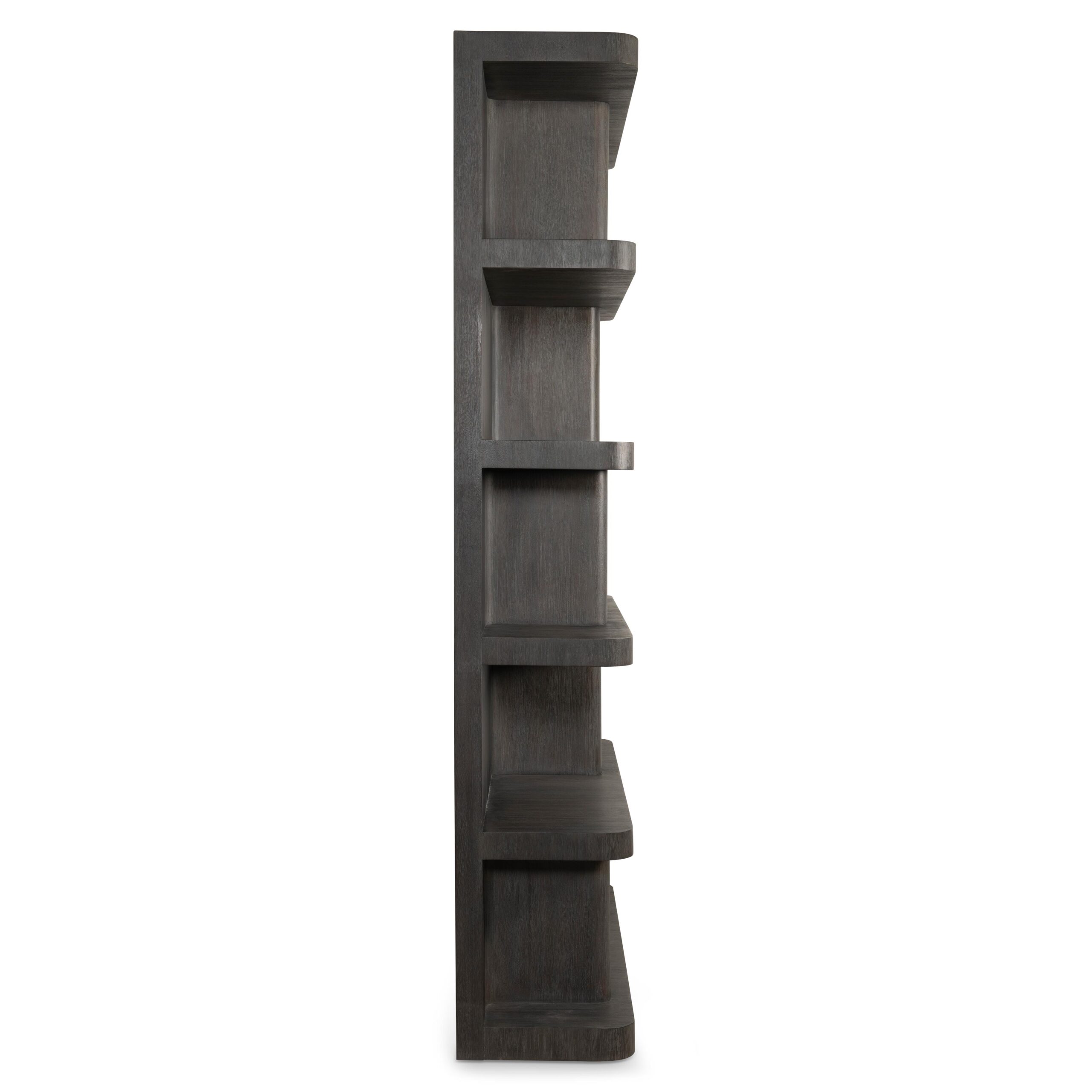 The Boyd etagere has five shelves with uniquely sized panels that create chic modern storage. Inspired by midcentury modern design, but updated for modern living, the etagere is crafted from mahogany in our dark, Bracken finish.