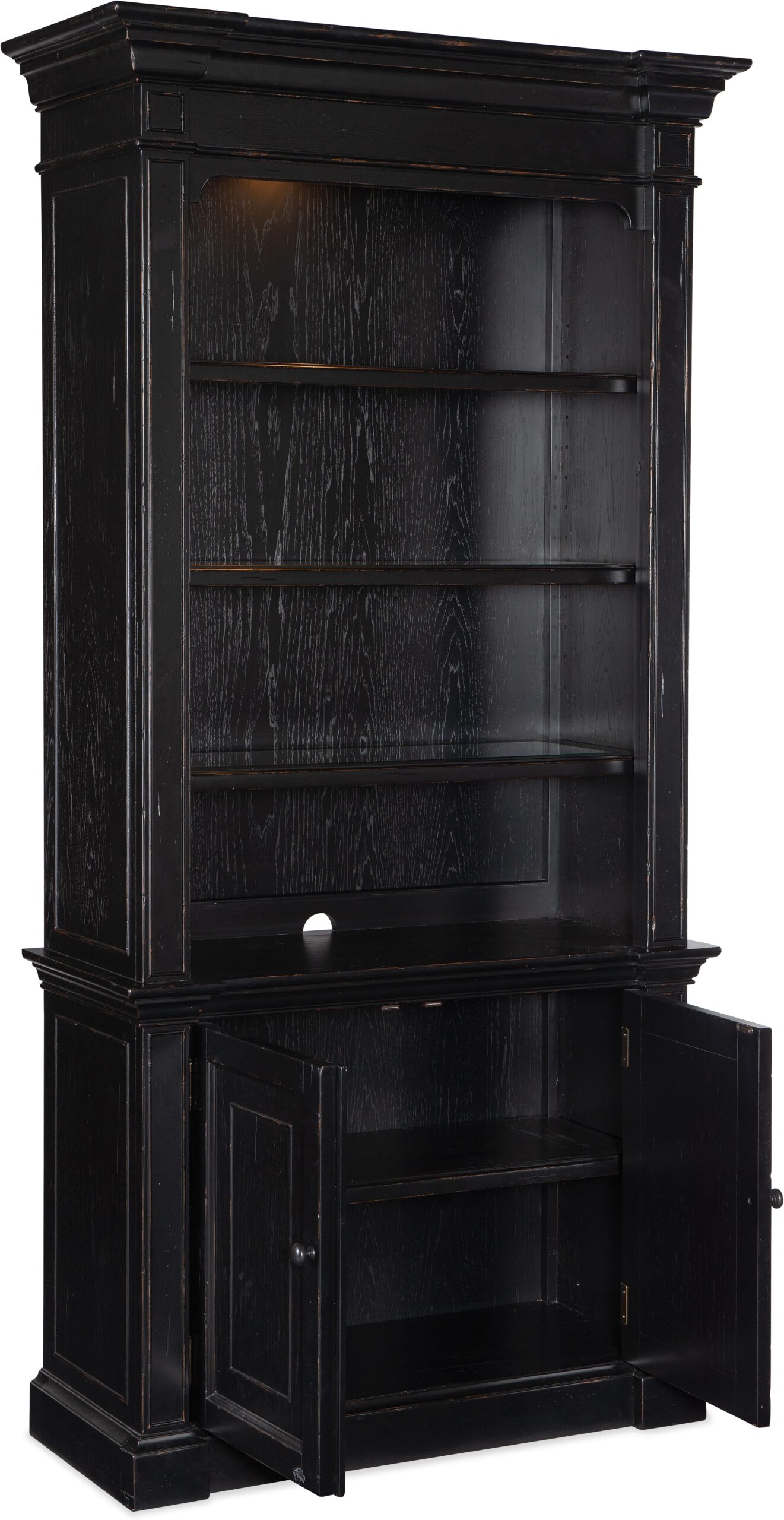 Casual yet refined and stylish, the Bristowe Bookcase sets a professional and inviting tone for any work-from-home or living space. Crafted of Pecan Veneers in a Tuxedo black paint finish with touches of warm brown, the bookcase has two doors with one adjustable shelf behind and 3 adjustable wood shelves. Special features include anti-tip hardware and a puck light at the top with a touch-switch on the right pilaster. The Work Your Way program focuses on the new reality many consumers face as they continue to do much of their work from their homes. Available in five design styles, the program offers an assortment of key home office pieces for a variety of spaces Ð whether a dedicated executive home office or a more casual workstation. Ranging in scale and functionality, all of the groups within Work Your Way include an executive desk, a junior executive desk, a writing table, a lateral file, a credenza and hutch and a bookcase.