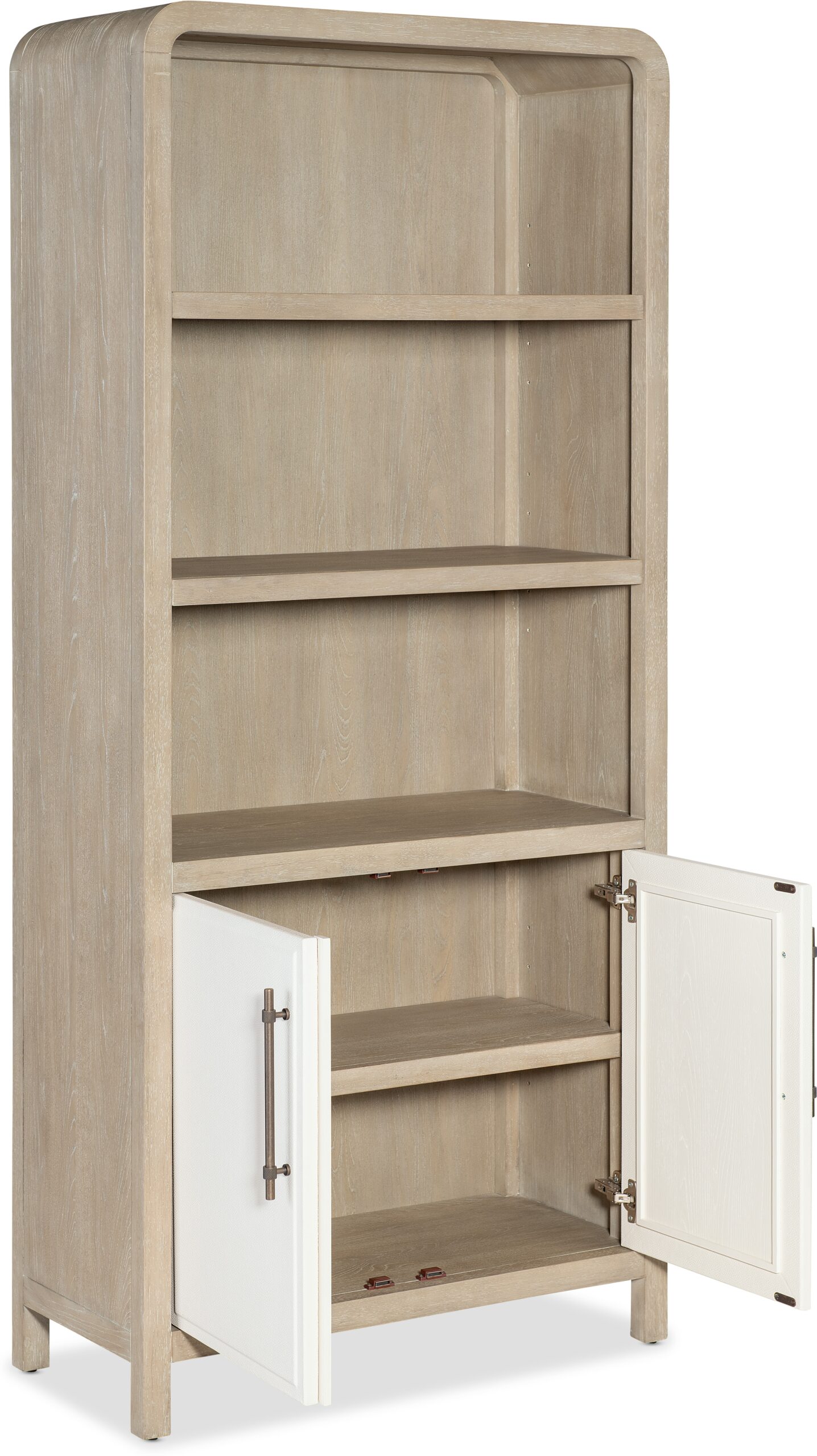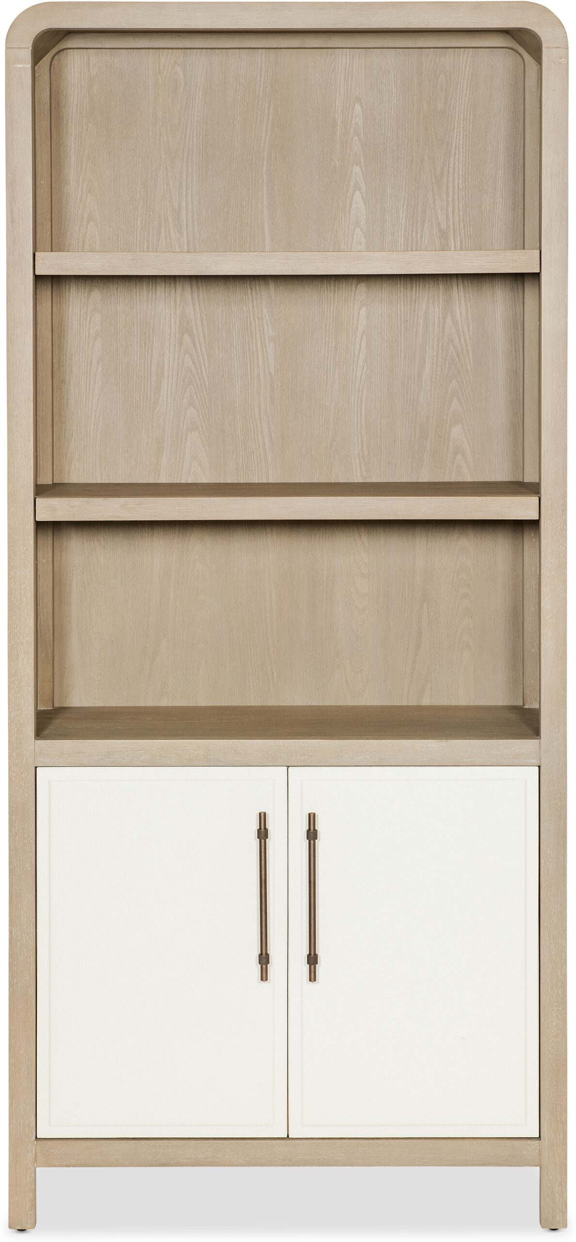 The Brixton Bookcase offers a stylish way to display and organize your books and décor. Featuring a distinctive two-tone finish with elm veneers in a soft pebble hue, complemented by ivory leathered doors, this bookcase is an elegant addition to any home office. It includes two adjustable shelves on top and concealed storage with doors at the bottom, offering both display and hidden storage options for your workspace or living area. The Brixton Home Office Collection is a thoughtfully designed trio featuring elegant, curved waterfall silhouettes that give the collection a sleek and contemporary aesthetic. The two-tone finish pairs soft, elm veneers in a pebble hue with door and drawer fronts in a contrasting ivory with leathered texture.