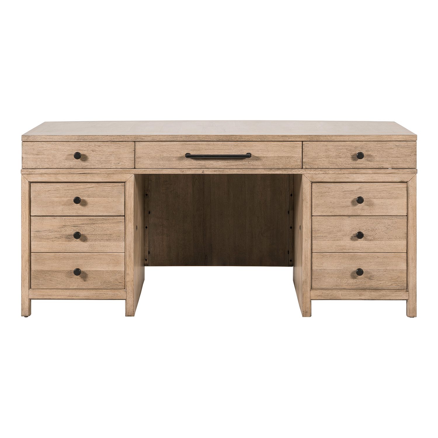 Create a refined and functional workspace with the Proximity Place Jr Executive Desk, crafted of Rubberwood solids with Rustic Flat Cut Birch veneers in a rich Barley Buff finish. The Jr Executive Desk makes a striking centerpiece with its graceful soft bow shaping, planked effect scoring, and a blend of practicality and style. It includes 2 locking file drawers, 4 additional storage drawers, and a center flip-down keyboard tray with wire management provisions.