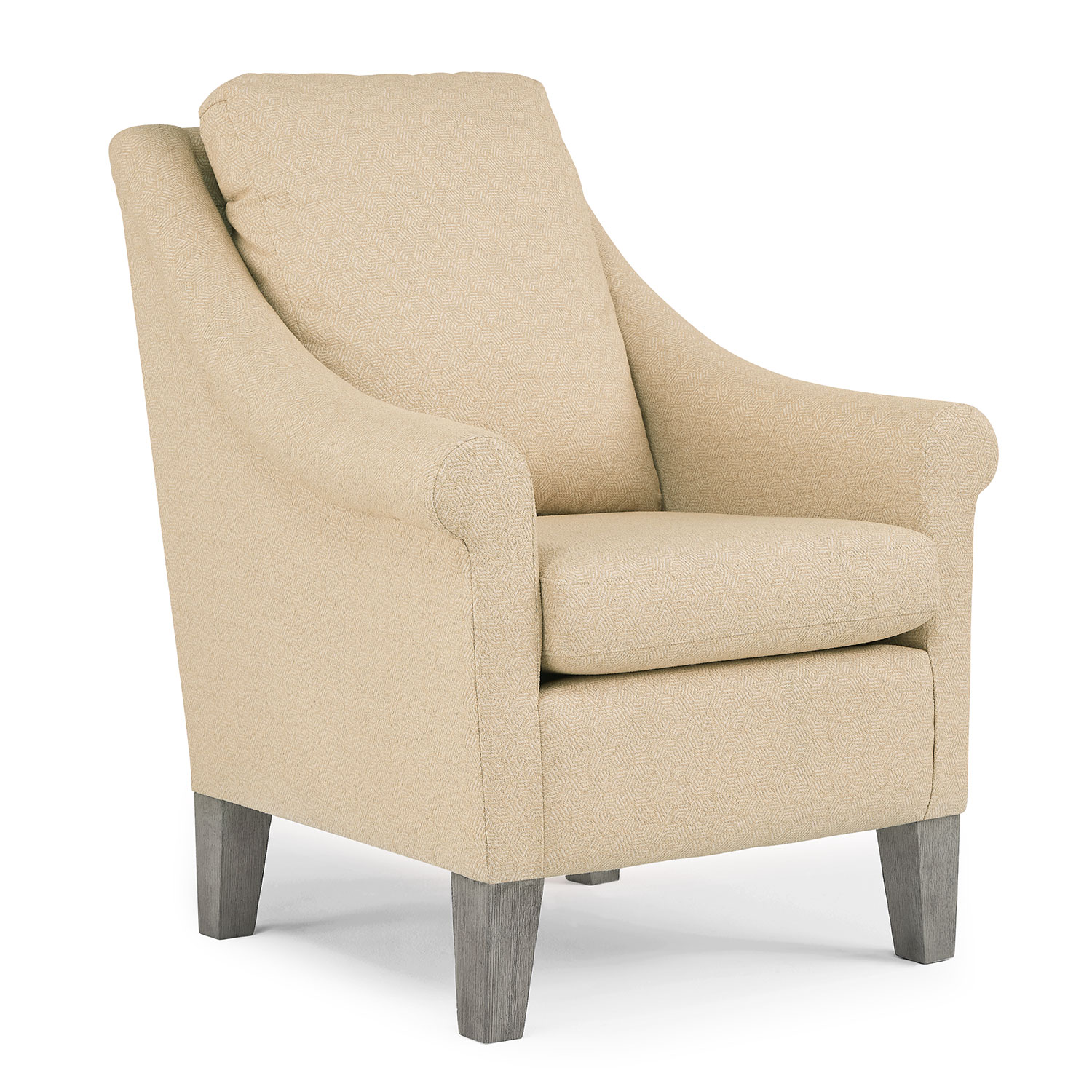 This transitionally designed club chair has more to it than meets the eye. Rolled arms that flow from the top of the back to the front of the arm offer a soothing visual aesthetic as well as padded comfort. The semi-attached back cushion has a bag with baffle and a zipper at the bottom for easy pillow fiber adjustments. The solid foam seat cushion is reversible and the back is accented with elegantly simple French seaming. Fully customizable, this chair is available in over 700 fabric options and in Dark Walnut, Espresso, and Honey Birch finishes. Relax with your feet up with the matching ottoman.