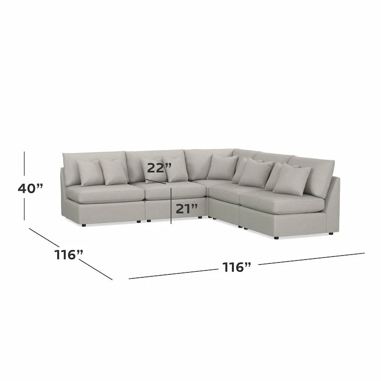 A transitional modular sectional with endless possibilities. Beckham has limited skus but can transform into as large or small as needed to fill your room. All pieces are top stitched, welt less with box seat cushions and loose knife edge back. The legs are finished in Walnut. Height Over All: 40″Depth Over All: 116″Width Over All: 116″