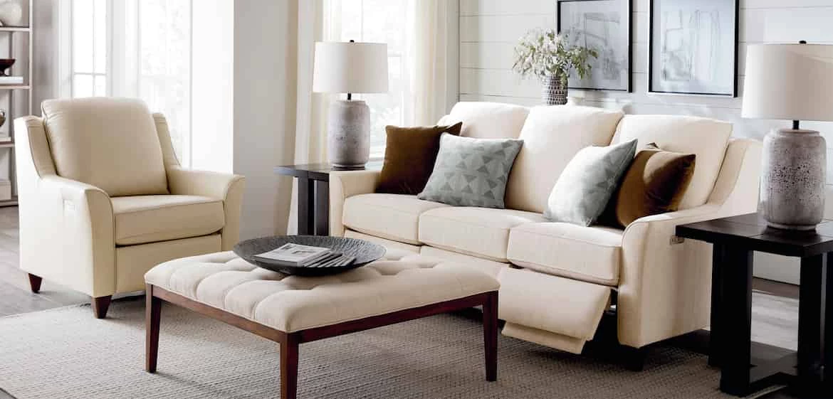 Choose from over 40 leathers. Say goodbye to ordinary recliners. This Magnificent Motion sofa is designed and engineered to be ingenious, but to look and feel like it’s stationary upholstery. With superior cushioning and coil springs seat support, you can relax and recline with a powered headrest. Buy now or customize it just the way you’d like it with your choice of arms (sock, panel, flair, setback or slope), semi-attached cushion back (boxed edge, knife edge or bed pillow), removable legs (turned, tapered or metal), arm caps, seat cushion fill, nailhead trim – even Bluetooth is an option. Made in the USA. W37″ D39″ H41.5″.