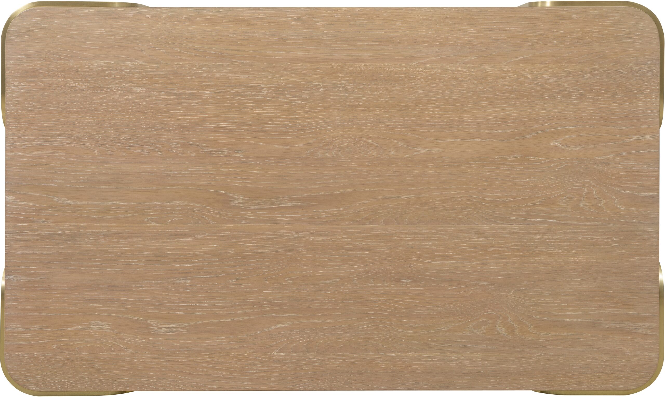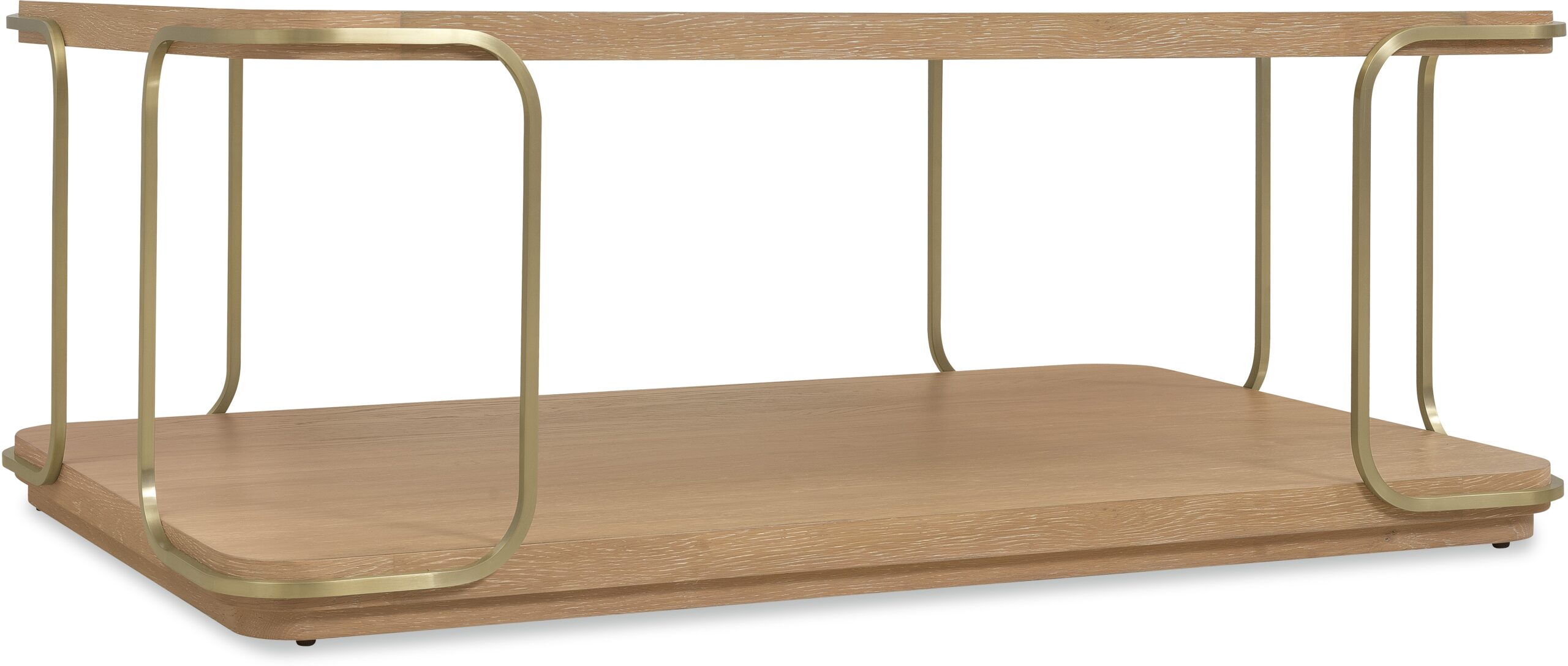 The Banyon Bay Rectangle Cocktail Table offers a stylish focal point for your living room. Crafted from white oak solids and oak veneers, it features a light Desert Oak finish, enhanced by a multi-step process with wire-brushing and cerusing for added texture. The brushed brass metal supports create a modern contrast to the wood’s warmth, while the rectangle shape with rounded corners adds a soft, welcoming touch. This table offers an open area for additional décor or storage, and its plinth base provides sturdy support. With its contemporary aesthetic, this cocktail table is perfect for casual settings with a hint of sophistication. Developed with an eclectic mindset, Banyon Bay is youthful and cool, combining precise geometry and gentle contours with natural textures and materials. Delivering smooth contemporary lines, this modern collection is a perfect fit for a casual lifestyle, moving effortlessly between urban, coastal, and mountain settings. Modestly scaled, this collection features white oak veneers and solids in a light Desert Oak finish, accented with an authentic mix of organic materials, creating a cohesive, casual look.