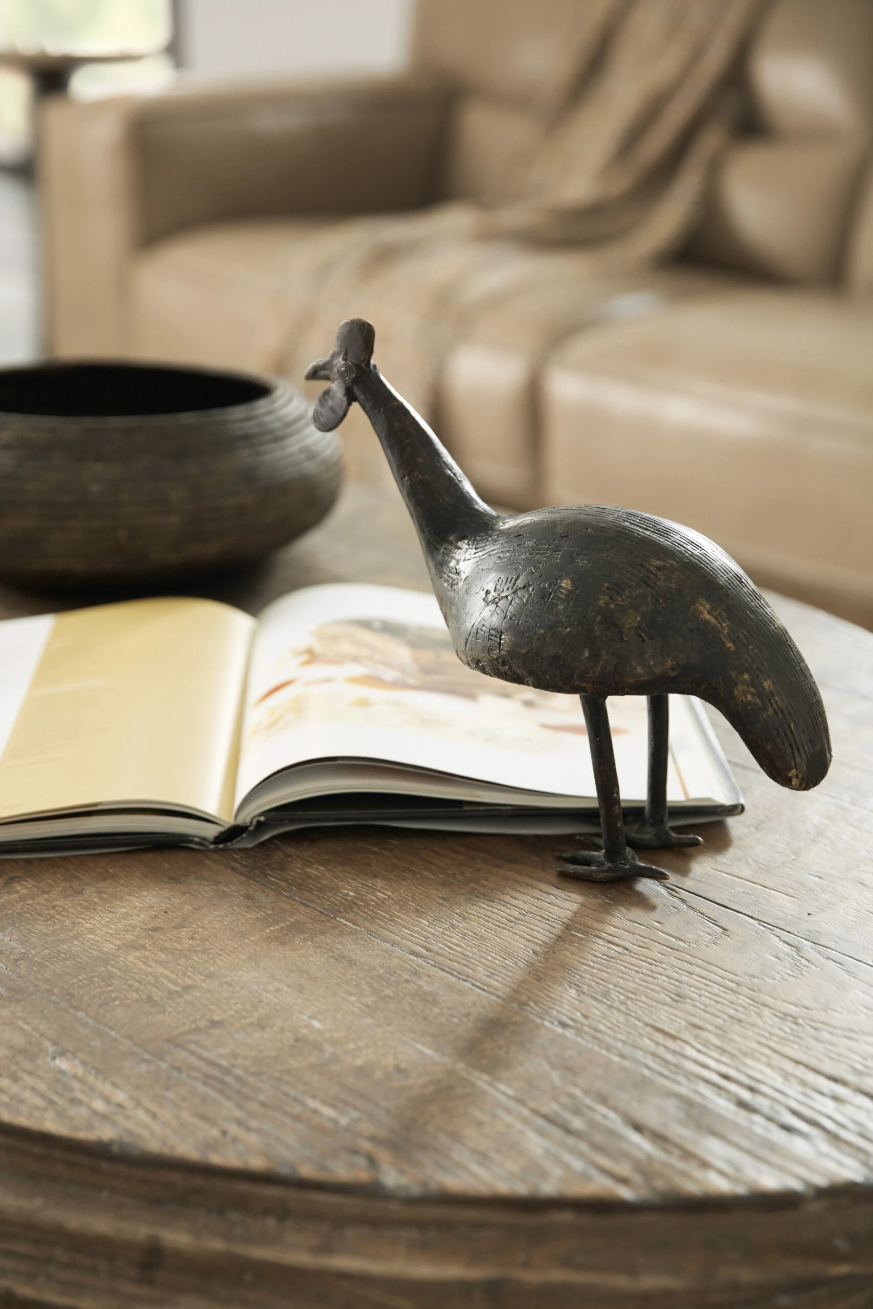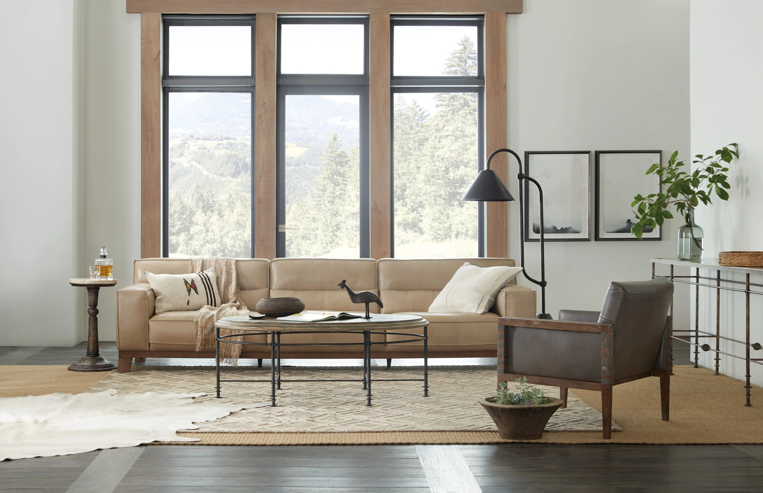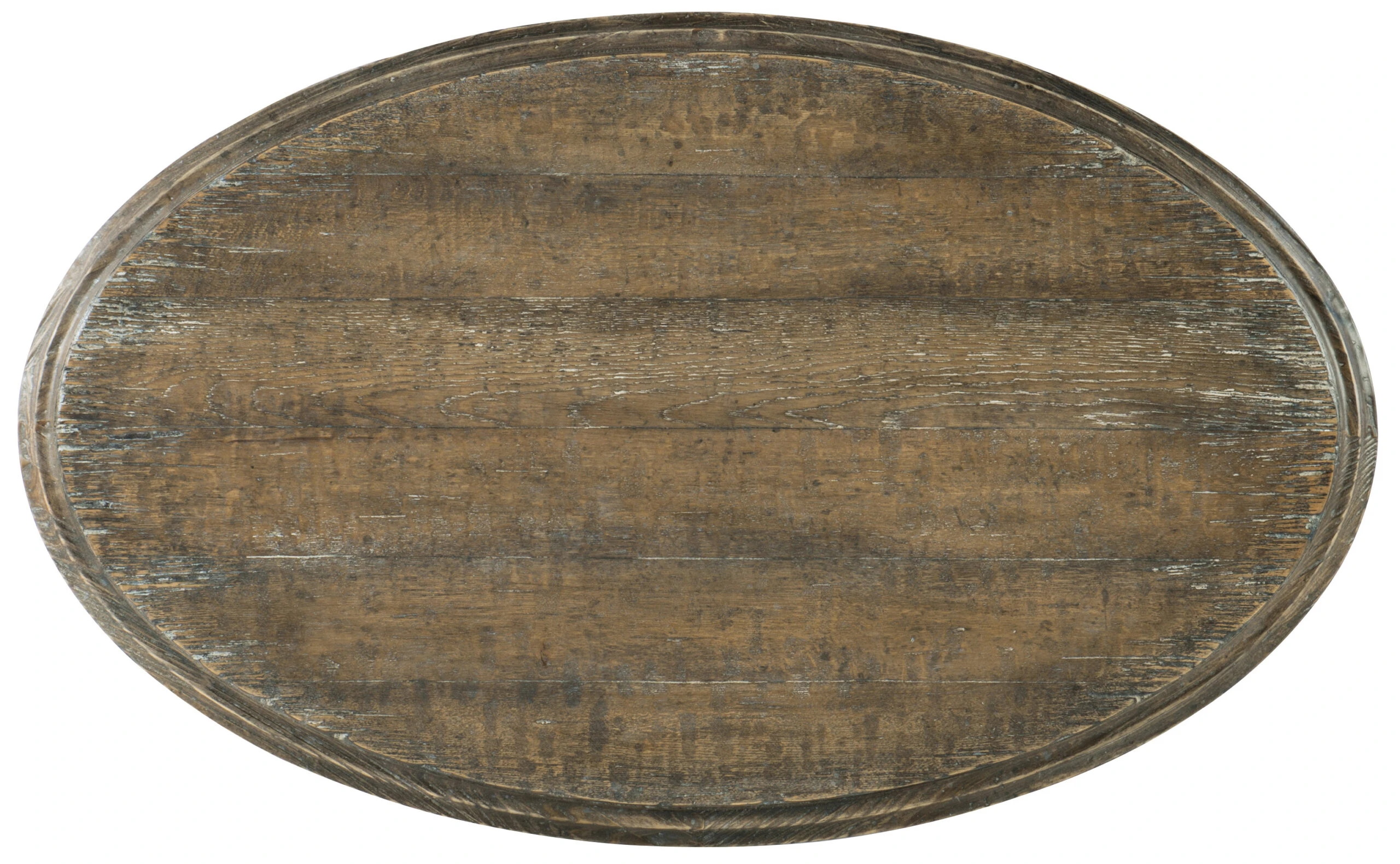 The American West meets industrial chic with the Faison Oval Cocktail table, a light and airy combination of a hardwood and rustic oak veneer top and aged metal legs. Finished in Washoff, a dry medium tone inspired by antiques.
