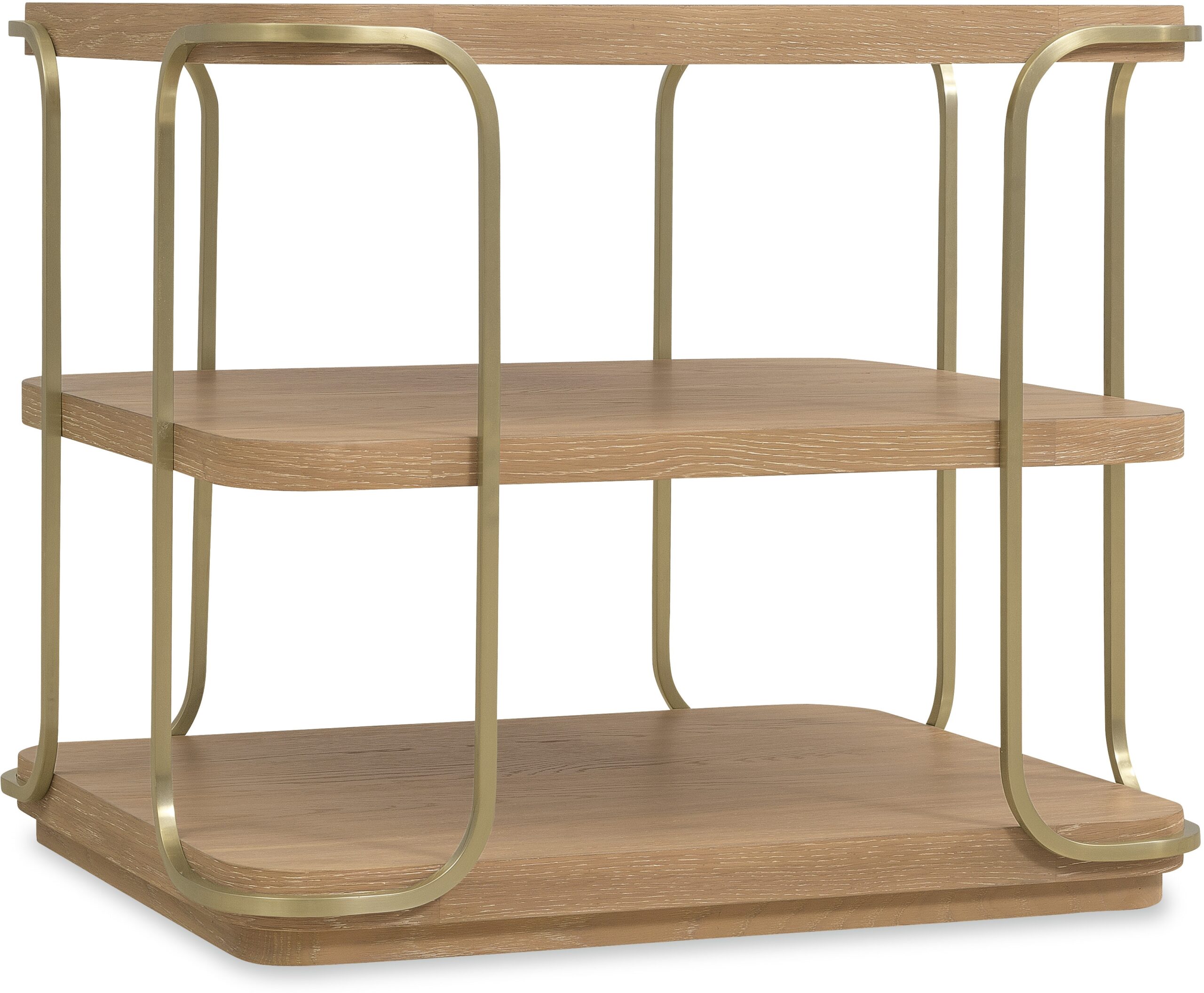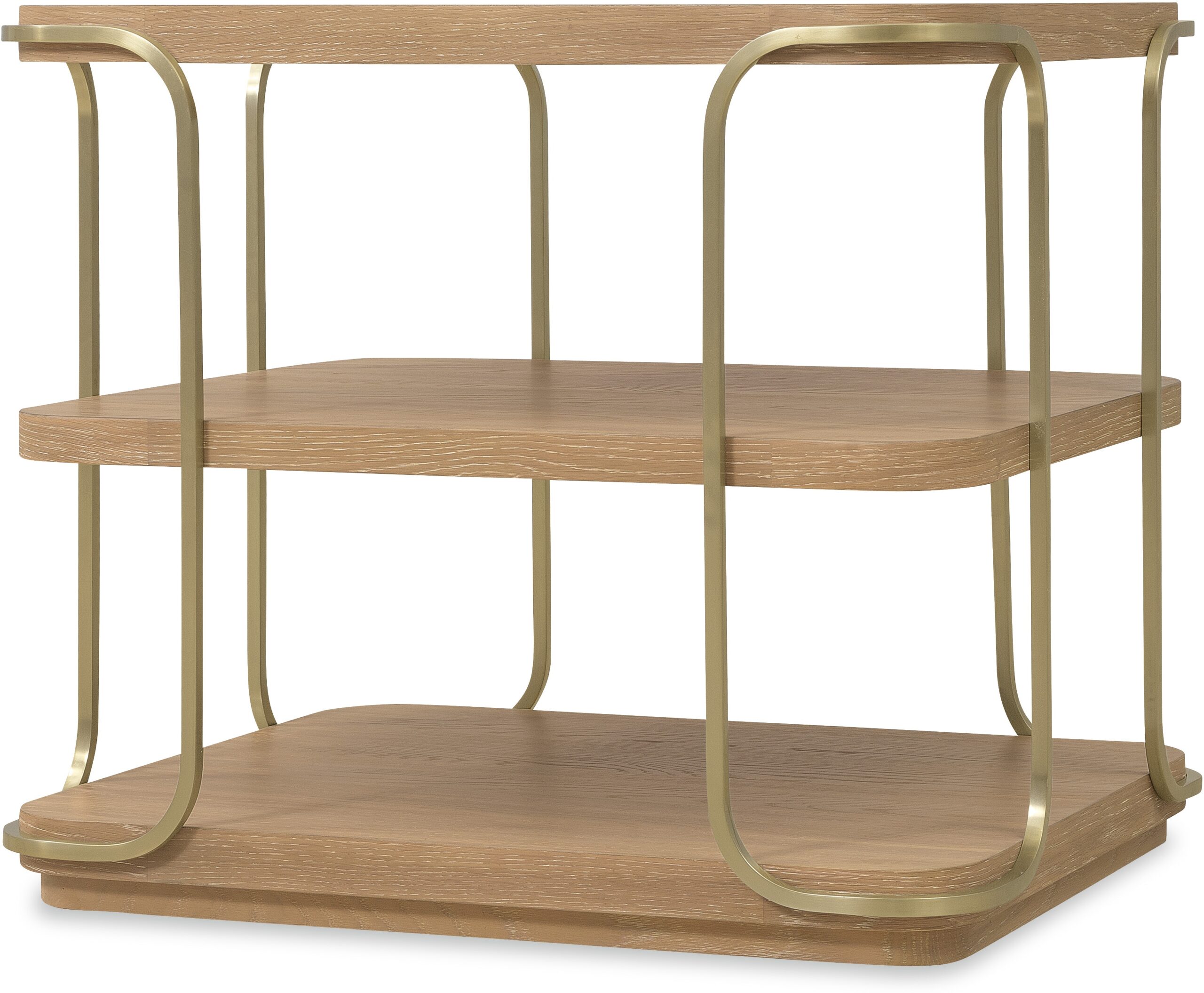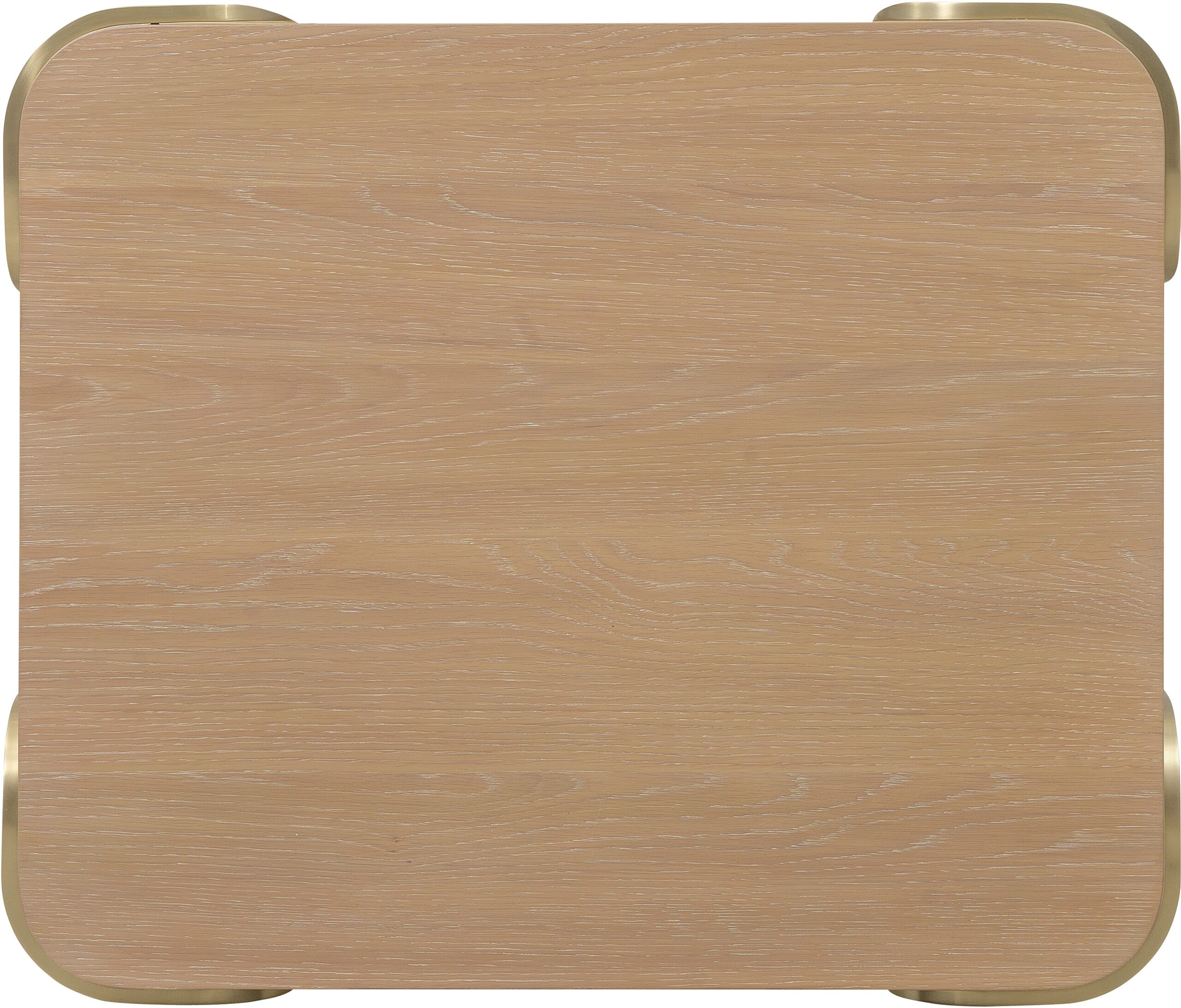 The Banyon Bay End Table is a compact and stylish piece, perfect for complementing a modern living space. Featuring white oak solids and veneers with brushed brass metal supports, this end table boasts a multi-step Desert Oak finish with wire-brushing and cerusing. The rectangle shape with rounded corners gives it a soft, contemporary appeal, while the one fixed shelf provides additional storage or display space. The plinth base offers stability, making this end table both functional and decorative. Ideal for urban, coastal, or mountain homes, its modern design blends effortlessly into a variety of living room settings. Developed with an eclectic mindset, Banyon Bay is youthful and cool, combining precise geometry and gentle contours with natural textures and materials. Delivering smooth contemporary lines, this modern collection is a perfect fit for a casual lifestyle, moving effortlessly between urban, coastal, and mountain settings. Modestly scaled, this collection features white oak veneers and solids in a light Desert Oak finish, accented with an authentic mix of organic materials, creating a cohesive, casual look.