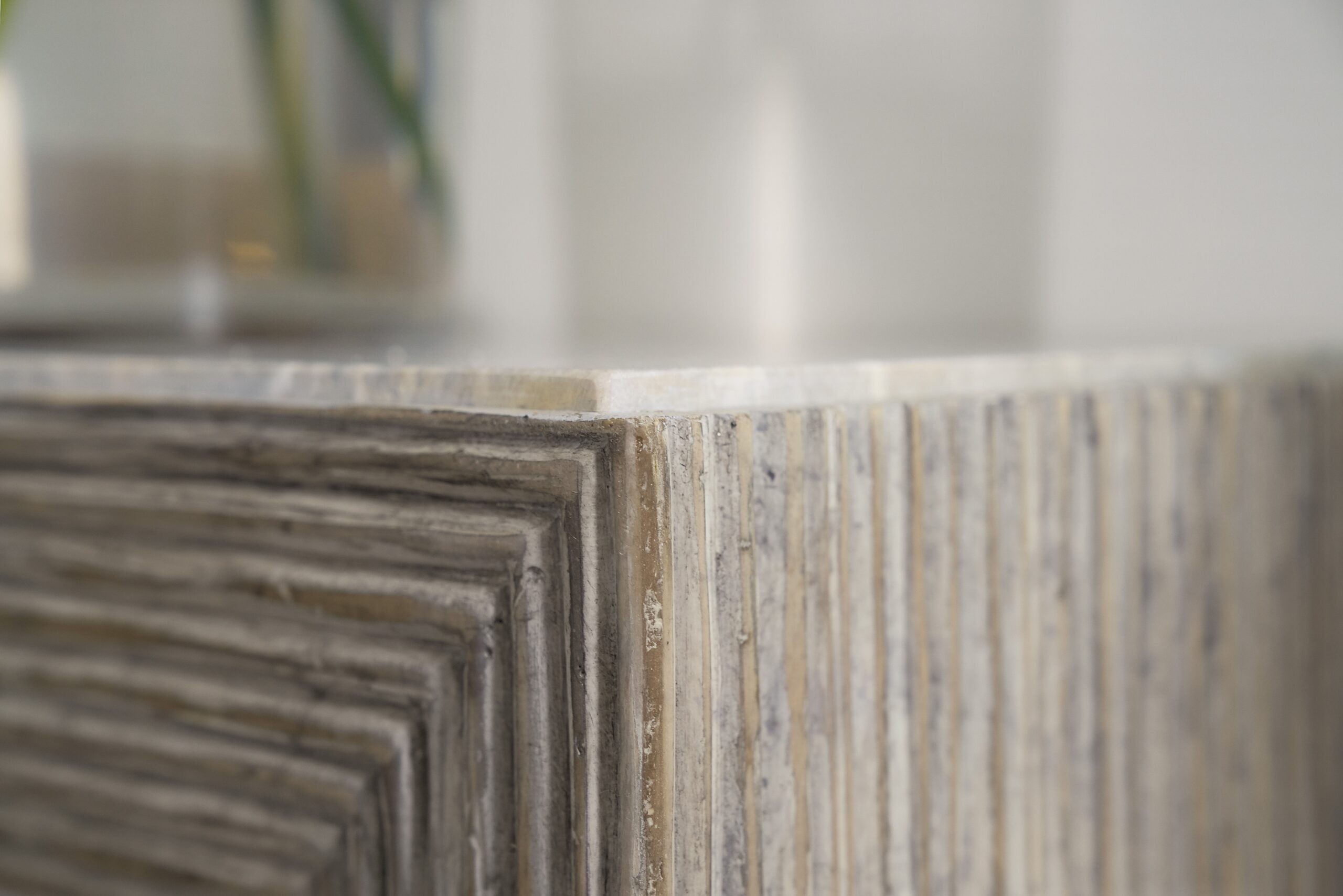 Infuse your space with tranquility with the organic and chic Armani Sofa Table crafted of Pecan wood with a Crema marble top featuring a soft veneer pattern. The neutral Brie finish is a grey tone with reeded details to complement a wide range of interiors. Inspired by a sophisticated approach to a life of leisure, the collection’s modern, yet casual style evokes memories of a place of refuge and retreat with its tranquil mix of organic materials and tonal wood tones. The collection includes dining room, occasional and accent pieces. Characterized by a mix of natural materials, the group includes stone, sandblasted capiz shell accents, raw metal details in a soft zinc finish, natural jute rope and lattice details. Combined with natural pecan veneers in three calming tonal finishes, Amani creates inviting spaces that epitomize a life of leisure.